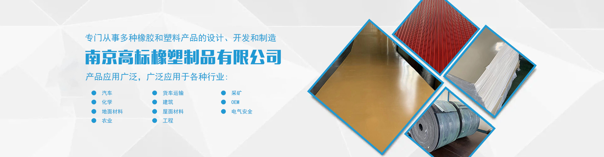 南京高標橡塑制品有限公司是一家專業的橡膠板、橡膠制品和熱塑性塑料產品的制造商。主營產品:三元乙丙橡膠板,丁腈橡膠版,氯丁橡膠板,丁苯橡膠板,丁基橡膠板,天然橡膠板,硅橡膠板,氟橡膠板,絕緣,防靜電,導電橡膠板,夾布,夾金屬網橡膠板,耐酸堿橡膠板,耐油橡膠板,耐磨橡膠板,阻燃橡膠板,阻尼橡膠板,減震橡膠板,防滑橡膠板,橡膠墊片等。 高標橡塑專門從事多種橡膠和塑料產品的設計、開發(fā)和制造。我們的產品應用廣泛。廣泛應用于各種行業,包括:汽車,貨車運輸,采礦,化學,建筑,OEM,地面材料,屋面材料,電氣安全,農業,工程等。 高標橡塑的客戶服務于許多行業,包括墊片切割、分銷商、工業用品零售商和批發(fā)商。自